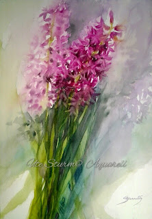 Im Hintergrund tauchen alle Farben noch einmal auf und weil das Ganze insgesamt zu violett war habe ich eine Lasur in Phtaloblau darüber gelegt. Ich hoffe, die Farben erinnern an den Duft der Hyazinthen .