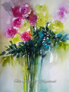 Für die Blüten habe ich Opera Rosa und Quinacridone Gold verwendet, Blätter und Stiele sind in Olivengrün und Umbra grünlich, alles von Sennelier